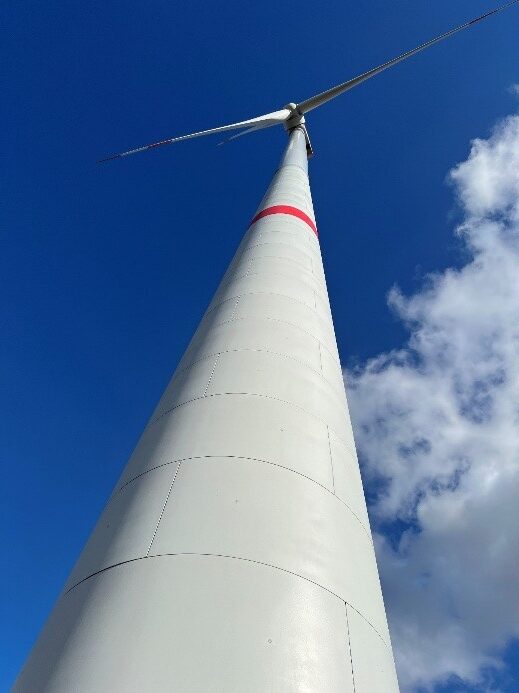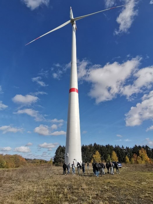 Den Abschluss der Exkursion bildete die Besichtigung des Windparks Schiffweiler. Bei strahlendem Sonnenschein konnten die Teilnehmenden das Innere einer 146 Meter hohen Windkraftanlage mit einem Rotordurchmesser von 92 Metern im laufenden Betrieb erkunden.